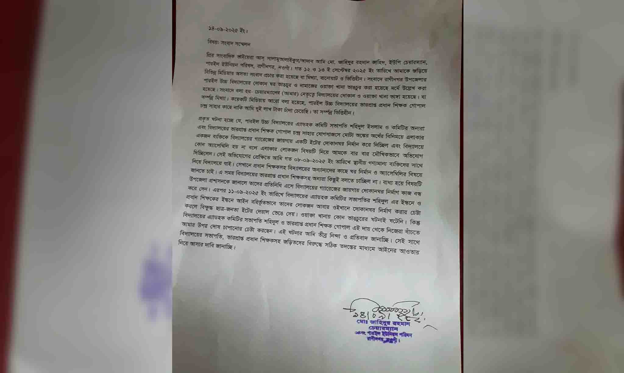 চেয়ারম্যান লিখিত বক্তব্যে বলেন, গত ১২ ও ১৩ সেপ্টেম্বর বিভিন্ন মিডিয়ায় তাকে নিয়ে অসত্য সংবাদ প্রচার করা হয়েছে যা সম্পূর্ণ মিথ্যা ও ভিত্তিহীন। তিনি দাবি করেন, বিদ্যালয়ের দোকানঘর বা নামাজের ওয়াক্তা খানা ভাঙচুরের সঙ্গে তিনি বা তার কোন সহযোগী জড়িত নন। এছাড়া ভারপ্রাপ্ত প্রধান শিক্ষকের কাছে দুই লাখ টাকা চাঁদার অভিযোগও মিথ্যা ও বানোয়াট।