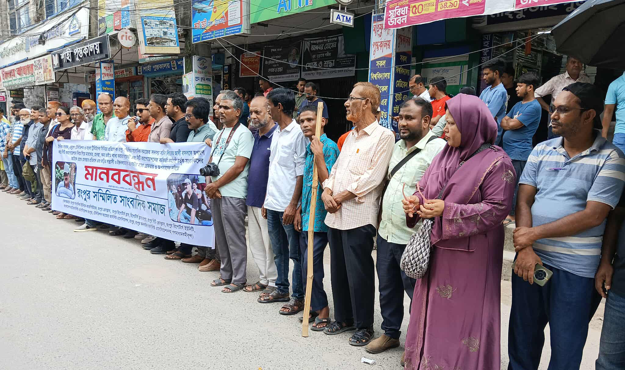 মানববন্ধনে বক্তব্য দেন রংপুর সাংবাদিক ইউনিয়নের সভাপতি সালেকুজ্জামান সালেকুজ্জামান, সাধারণ সম্পাদক মাজহারুল মান্নান, রংপুর রিপোর্টার্স ইউনিটির সভাপতি শরিফা বেগম শিউলী, রংপুর সিটি প্রেসক্লাবের সাধারণ সম্পাদক হুমায়ুন কবীর মানিক, রিপোর্টার্স ক্লাবের সভাপতি শাহ বায়েজীদ আহামেদ, প্রেসক্লাবের সাবেক সভাপতি মাহবুব রহমানসহ আরও অনেকে। বক্তারা একেধারে বলেন, “সাংবাদিকের ওপর হামলা মানে গণমাধ্যম ও সংবাদপ্রসূত গণতন্ত্রের ওপর হামলা।” তাঁরা হামলাকারীদের দৃষ্টান্তমূলক শাস্তি ও সিইওকে অবিলম্বে অপসারণ দাবি করে ন্যায়বিচার নিশ্চিত না হলে রাজপথে নামার ঘোষণা দেন।