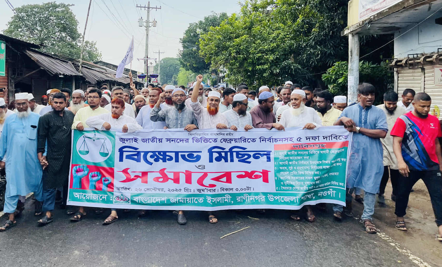 জুলাই জাতীয় সনদ ও পিআর (প্রোপোরশনাল রিপ্রেজেন্টেশন) পদ্ধতিতে আগামী ফেব্রুয়ারিতে জাতীয় নির্বাচনসহ ৫ দফা দাবিতে নওগাঁর রাণীনগরে বিক্ষোভ মিছিল করেছে উপজেলা জামায়াতে ইসলামী। শুক্রবার বিকেলে উপজেলা সদরের উচ্চ বালিকা বিদ্যালয়ের সামনে থেকে এক বিশাল বিক্ষোভ মিছিল বের করা হয়।