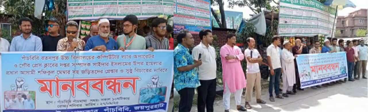 জয়পুরহাটের পাঁচবিবিতে রতনপুর উচ্চ বিদ্যালয়ের কম্পিউটার ল্যাব অপারেটর ও পৌর প্রেসক্লাবের দপ্তর সম্পাদক সাইদার ইসলামের উপর হামলার প্রধান আসামী শফিকুল মেম্বারসহ জড়িতদের গ্রেফতার এবং সুষ্ঠু বিচারের দাবিতে মানববন্ধন অনুষ্ঠিত হয়েছে।
