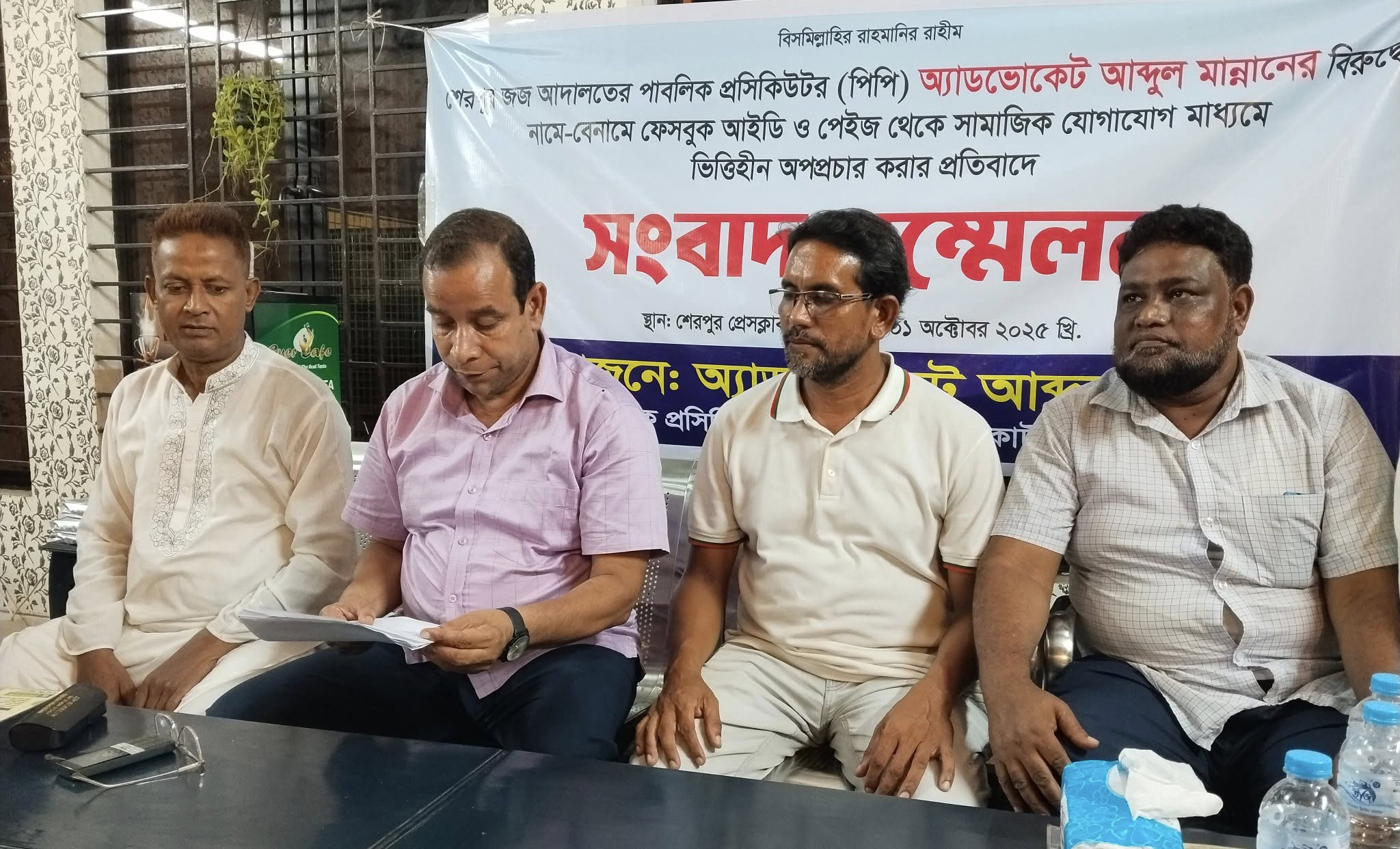 শেরপুর জজ আদালতের পাবলিক প্রসিকিউটর (পিপি) অ্যাডভোকেট আব্দুল মান্নান মিথ্যা, ভিত্তিহীন ও বানোয়াট অপপ্রচারের বিরুদ্ধে সংবাদ সম্মেলন করেছেন। বুধবার (১ অক্টোবর) রাতে শেরপুর জেলা ও দায়রা জজ আদালত প্রাঙ্গণে ন্যায়কুঞ্জে এ সংবাদ সম্মেলন অনুষ্ঠিত হয়।