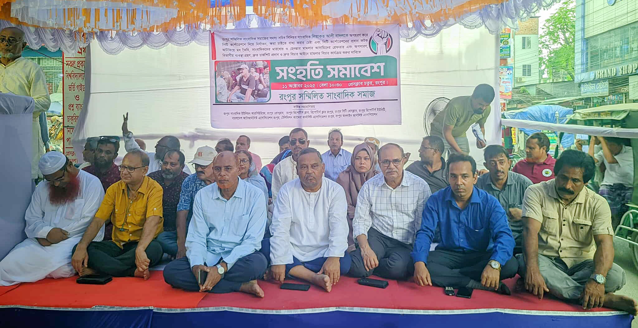 রংপুর — সিনিয়র সাংবাদিক লিয়াকত আলী বাদলকে অপহরণ, মারধর ও সাংবাদিকদের হেনস্তার ঘটনার ন্যায়বিচারের দাবিতে রংপুর সম্মিলিত সাংবাদিক সমাজ শনিবার (১১ অক্টোবর) প্রেসক্লাবের সামনে সংহতি সমাবেশ করেছে। সমাবেশে দ্রুত গ্রেফতার, বিভাগীয় এবং দন্ডমূলক ব্যবস্থা গ্রহণসহ ঘটনার সম্পূর্ণ তদন্ত ও চার্জশিট প্রদানের দাবি জানানো হয়।