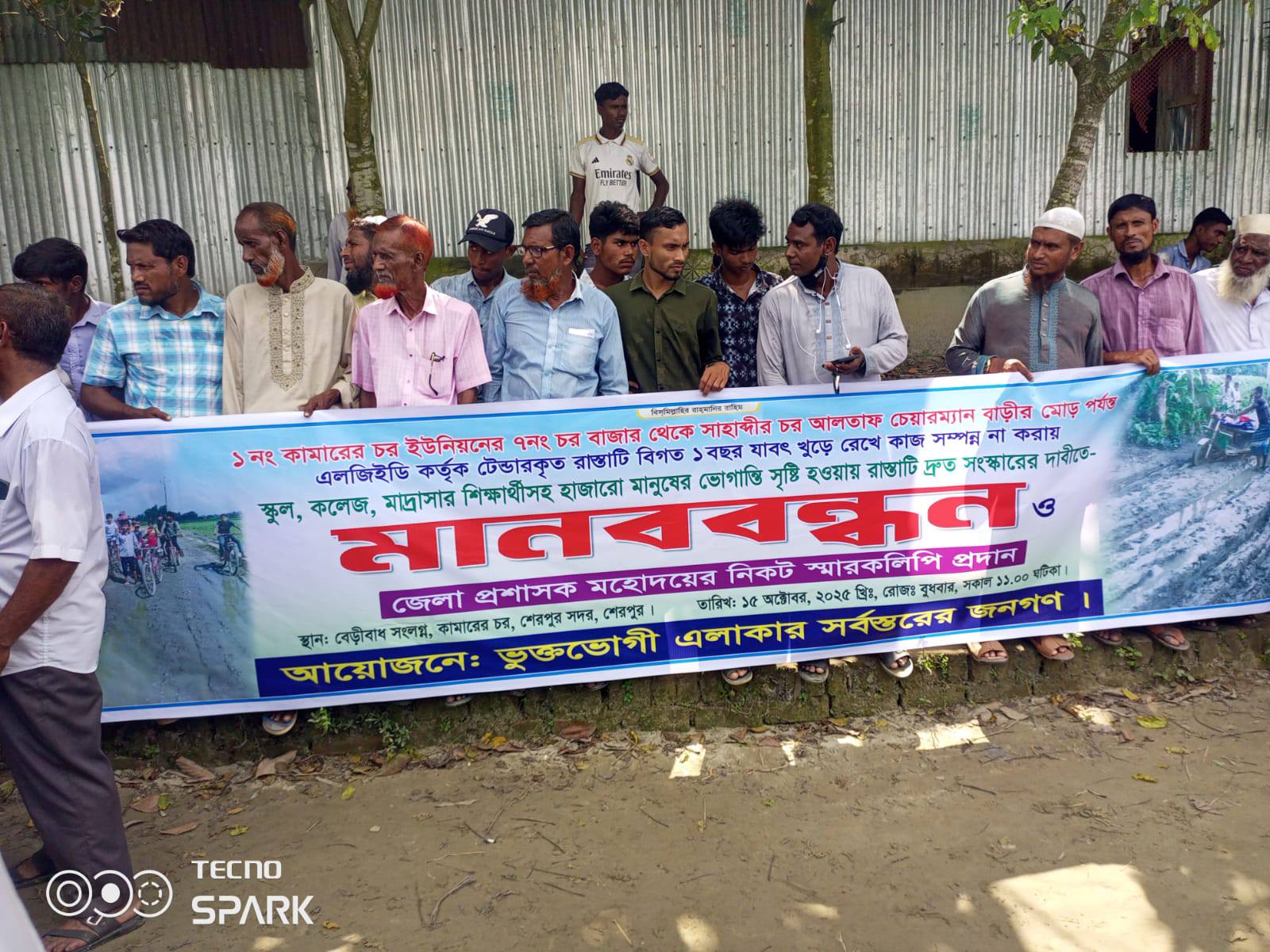 আট বছরের অপেক্ষা পেরিয়ে শেরপুর সদরের কামারের চরের মানুষ আজও কাদা আর ধুলোর নরকে বন্দি। মাত্র এক কিলোমিটার পথ—মধ্য কামারের চর ঈদগাহ মাঠ থেকে চর পক্ষীমারী বাজার পর্যন্ত—যেন দুই হাজার পরিবারের জীবনের বন্ধন ও বেদনার প্রতীক হয়ে উঠেছে।