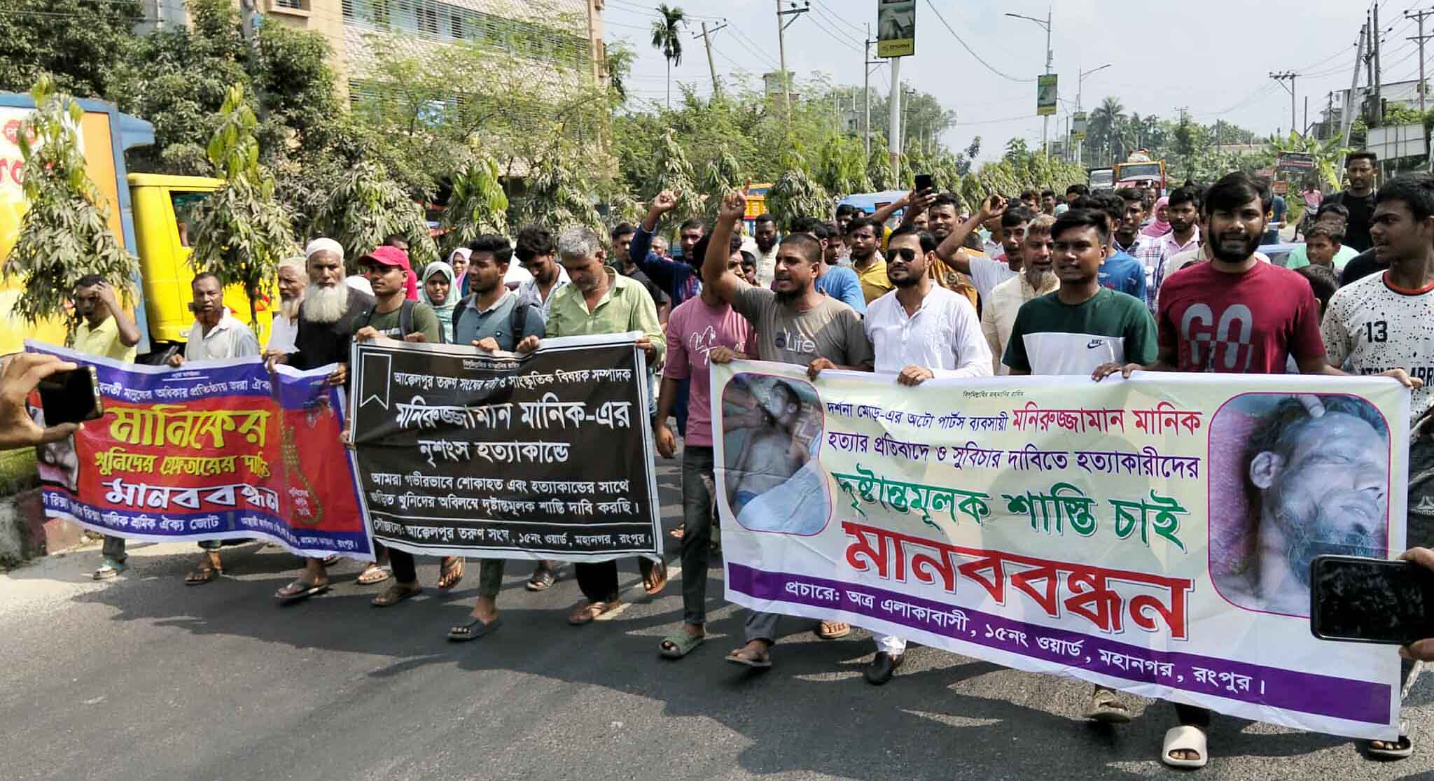 রংপুর নগরীর দর্শনা এলাকার অটো পার্টস ব্যবসায়ী মনিরুজ্জামান মানিক হত্যার প্রতিবাদে সুবিচার ও হত্যাকারীদের দৃষ্টান্তমূলক শাস্তির দাবিতে মানববন্ধন করেছে এলাকাবাসী।