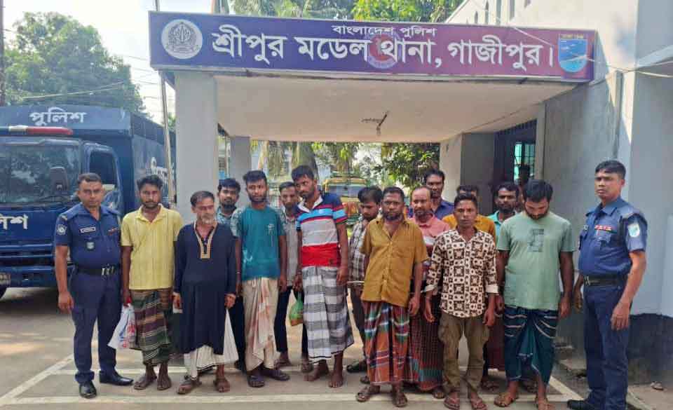 গাজীপুরের শ্রীপুর থানার বিভিন্ন এলাকায় সোমবার (২৭ অক্টোবর ২০২৫) রাতে থানা পুলিশের বিশেষ অভিযান পরিচালিত হয়েছে। অভিযানে মাদক ব্যবসায়ী, জুয়াড়ি, গ্রেফতারি পরোয়ানাভুক্ত আসামিসহ বিভিন্ন অপরাধমূলক কর্মকাণ্ডে জড়িত মোট ১৫ জনকে গ্রেফতার করেছে পুলিশ।