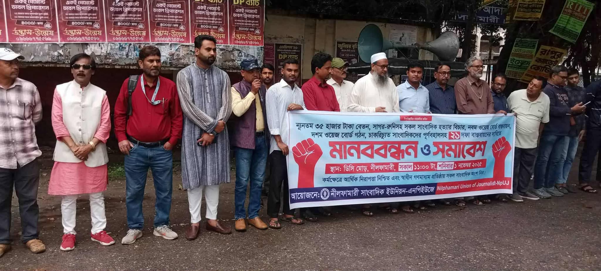 ঝুম বৃষ্টির মধ্যেও ন্যায্য অধিকার ও মর্যাদার দাবিতে নীলফামারীর সংবাদকর্মীরা শনিবার (১ নভেম্বর) শহরের ডিসি মোড়ে মানববন্ধন অনুষ্ঠিত করেন। জেলা প্রিন্ট, অনলাইন ও ইলেকট্রনিক মিডিয়ার সাংবাদিকরা মুষলধারে বৃষ্টি উপেক্ষা করে এই মানববন্ধনে অংশ নেন।
