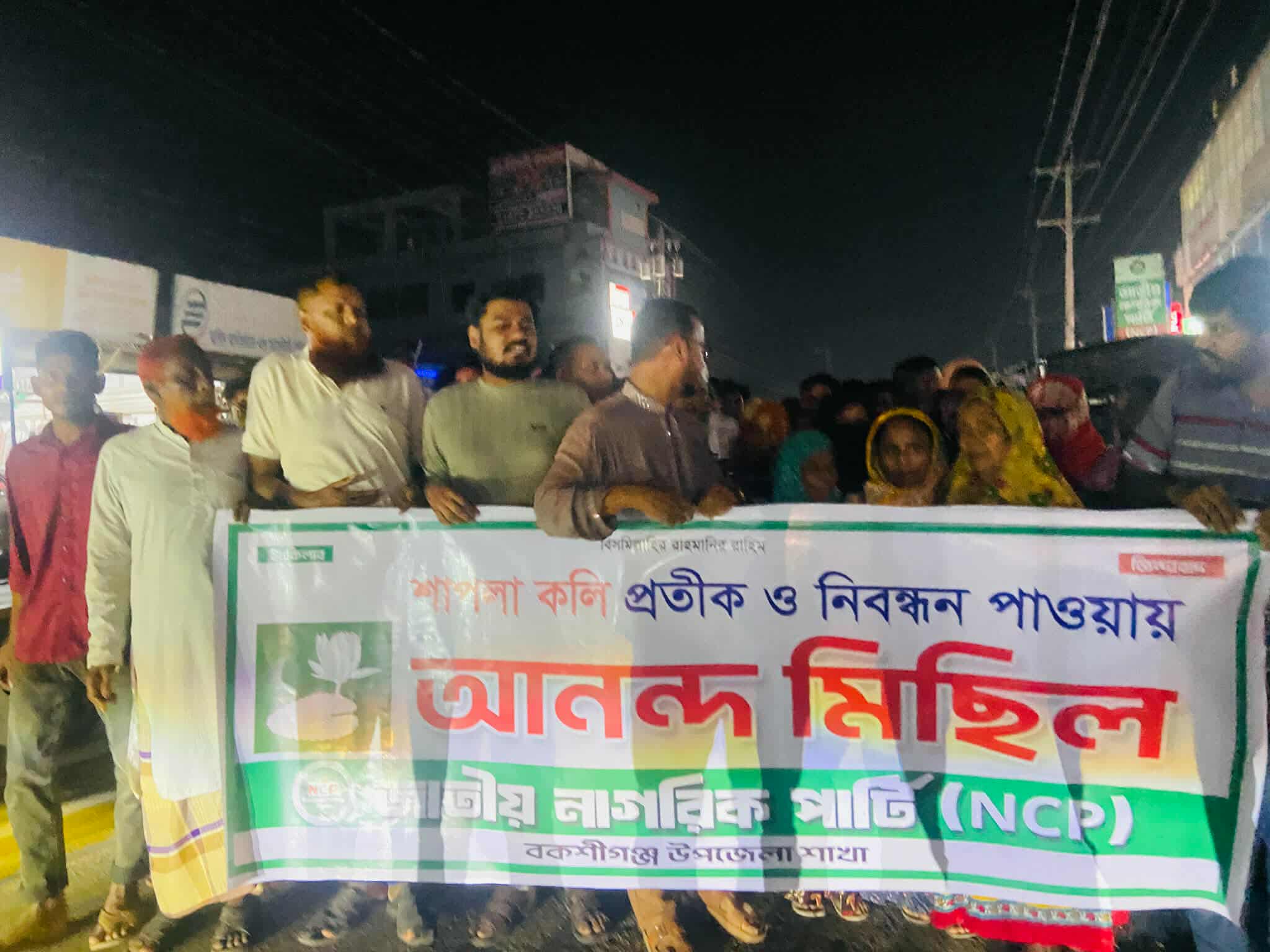 আনন্দ মিছিলটি পৌর শহরের বিভিন্ন সড়ক প্রদিক্ষণ শেষে দলীয় কার্যালয়ের সামনে এসে শেষ হয়। মিছিলের পর সংক্ষিপ্ত আলোচনায় বক্তব্য রাখেন এনসিপির কেন্দ্রীয় কমিটির সদস্য মশিউর আমিন শুভ, বকশীগঞ্জ উপজেলা কমিটির প্রধান সমন্বয়কারী মোসাদ্দেকুর রহমান মানিক, যুগ্ম সমন্বয়কারী তৌহিদুজ্জামান তৌহিদ, যুগ্ম সমন্বয়কারী এমদাদুল হক মিলন, যুগ্ম সমন্বয়কারী রাশেদুজ্জামান রাজু, পৌর কমিটির যুগ্ম সমন্বয়কারী এডি মোস্তাক আহমেদ, ধানুয়া কামালপুর ইউনিয়নের প্রধান সমন্বয়কারী আবু যাইদ অপু, সদর ইউনিয়নের নেতা সালাউদ্দিন প্রাইস, এনসিপি নেতা সুলতানুস সালেহীন সহ উপজেলা, পৌর ও বিভিন্ন ইউনিয়নের নেতা-কর্মীরা।