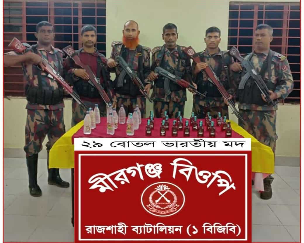 বিজিবি সূত্রে জানা যায়, রাত আনুমানিক ৩টা ২০ মিনিট থেকে ৪টা ১৫ মিনিট পর্যন্ত মীরগঞ্জ ও আলাইপুর বিওপির দায়িত্বপূর্ণ এলাকায় টহল দল দুটি পৃথক অভিযান চালায়। এ সময় সীমান্ত পিলার ৭৮/২-এস হতে প্রায় ২ কিলোমিটার বাংলাদেশের অভ্যন্তরে মাহাদীপুর এলাকায় একটি পরিত্যক্ত বস্তা থেকে ১৯ বোতল ভারতীয় Old Monk রাম ও ১০ বোতল JD ব্র্যান্ডের মদ উদ্ধার করা হয়।