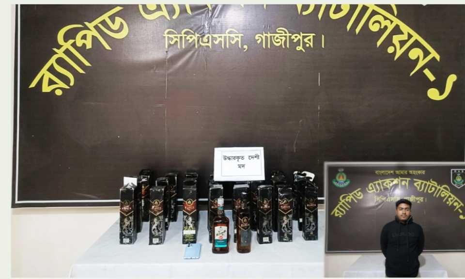 গাজীপুরের শ্রীপুরে মাদকবিরোধী বিশেষ অভিযানে র্যাব-১ এর পোড়াবাড়ি ক্যাম্পের একটি দল ২৫ বোতল ভারতীয় তৈরি বিদেশি মদসহ এক যুবককে গ্রেপ্তার করেছে। বুধবার (১৯ নভেম্বর) দুপুরে শ্রীপুরের মাওনা এলাকার লিরা পলিমার ইন্ডাস্ট্রিজ লিমিটেডের সামনে অভিযান চালানো হয়। র্যাব জানায়, গোয়েন্দা সূত্রে খবর আসে মাওনা চকপাড়া এলাকা থেকে একটি মোটরসাইকেলে বিশেষ চালান নিয়ে একজন ব্যক্তি শ্রীপুরের দিকে আসছে। খবরের ভিত্তিতে র্যাব–১ এর আভিযানিক দল ওই এলাকায় অবস্থান নেয়। পরে বিকেল ২টা ৫৫ মিনিটে সন্দেহজনক মোটরসাইকেল থামিয়ে মো. শাহাদাত হোসেন সান্ত (২৩) নামে একজনকে আটক করা হয়। আটক শাহাদাত শ্রীপুরের মাওনা এলাকার বাসিন্দা। তার কাছ থেকে ২৫ বোতল বিদেশি মদ (মোট ১৮.৭৫ লিটার), একটি মোবাইল ফোন ও একটি মোটরসাইকেল জব্দ করা হয়েছে। র্যাব–১ কোম্পানি কমান্ডার লেফটেন্যান্ট নাফিজ বিন জামাল বলেন, “মাদক চোরাচালানকারীদের বিরুদ্ধে র্যাবের বিশেষ অভিযান চলমান। গোপন সংবাদের ভিত্তিতে আজকের অভিযান পরিচালনা করা হয়েছে। আটক ব্যক্তি দীর্ঘদিন ধরে আমদানি নিষিদ্ধ ভারতীয় মদ চোরাচালান ও বিক্রির সঙ্গে জড়িত থাকার কথা স্বীকার করেছে। প্রাথমিকভাবে ধারণা করা হচ্ছে, সে গাজীপুরসহ আশপাশের এলাকায় মাদক সরবরাহের একটি চক্রের সঙ্গে যুক্ত। র্যাবের জিজ্ঞাসাবাদে শাহাদাত জানায়, তিনি দেশের বিভিন্ন জেলা থেকে ভারতীয় মদ সংগ্রহ করে গাজীপুরের বিভিন্ন এলাকায় পাইকারি ও খুচরা বিক্রি করতেন। এ কাজে তিনি ২০১৮ সালের মাদকদ্রব্য নিয়ন্ত্রণ আইনের ৩৬(১) এর সারণীর ২৪(খ)/৩৮ ধারার আওতায় শাস্তিযোগ্য অপরাধ করে আসছিলেন। গ্রেপ্তারকৃত ব্যক্তিকে পরবর্তী আইনগত ব্যবস্থা গ্রহণের জন্য শ্রীপুর থানা পুলিশের কাছে হস্তান্তর করা হয়েছে।