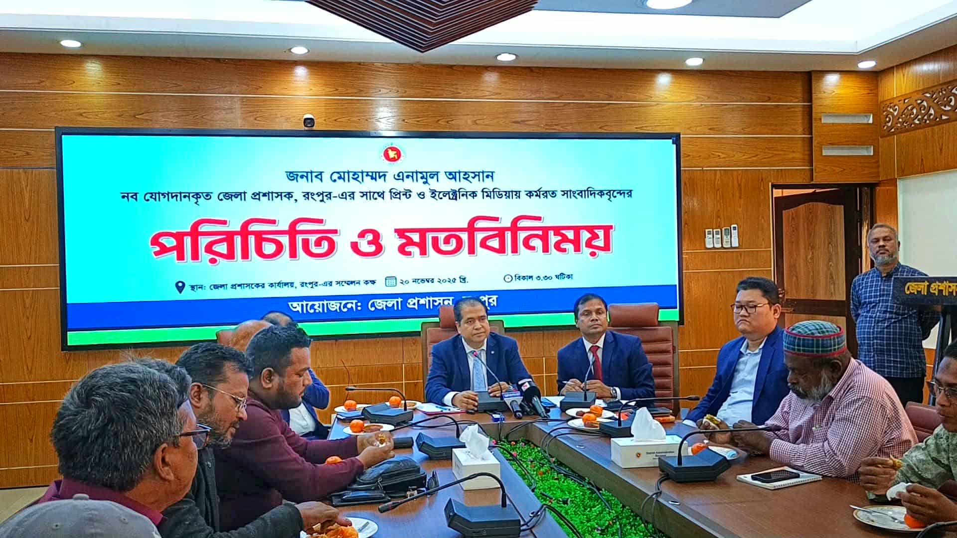 রংপুর জেলায় কর্মরত বিভিন্ন প্রিন্ট ও ইলেকট্রনিক মিডিয়ার সাংবাদিকদের সঙ্গে নব্য জেলা প্রশাসক মোহাম্মদ এনামুল আহসানের পরিচিতি ও মতবিনিময় সভা অনুষ্ঠিত হয়েছে।
