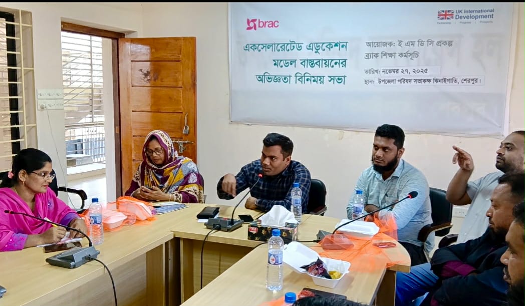 শেরপুরের ঝিনাইগাতিতে ব্র্যাক শিক্ষা কর্মসূচির একসেলারেটেড এডুকেশন মডেল (ইএমডিসি) বাস্তবায়ন নিয়ে এক অভিজ্ঞতা বিনিময় সভা অনুষ্ঠিত হয়েছে। ব্র্যাক শিক্ষা কর্মসূচির আয়োজনে বৃহস্পতিবার (২৭ নভেম্বর) সকালে উপজেলা পরিষদ সভাকক্ষে এই সভা অনুষ্ঠিত হয়। অনুষ্ঠানে স্বাগত বক্তব্য রাখেন ব্র্যাকের জেলা সমন্বয়ক ফারহানা মিল্কী।