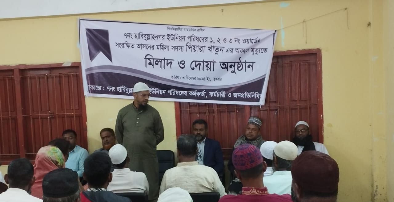 শুক্রবার হাবিবুল্লাহ নগর ইউনিয়ন পরিষদ প্রাঙ্গণে এ শোকসভা ও দোয়া মাহফিল আয়োজন করা হয়। অনুষ্ঠানে সভাপতিত্ব করেন ইউনিয়ন প্রশাসক রবিউল রানা। উপস্থিত ছিলেন ইউপি সচিব মিলন চন্দ্র ঘোষ, ইউপি সদস্য শাহাদৎ হোসেন, জনাব আলী, জাহিদ হাসান, মহিলা ইউপি সদস্য মঞ্জুয়ারা খাতুন ও মনিজা খাতুন মুন্নি। আরও উপস্থিত ছিলেন ইউনিয়ন বিএনপির সাবেক সভাপতি আলহাজ্ব মনির হোসেন, সাংগঠনিক সম্পাদক রউফসহ স্থানীয় জনসাধারণ।