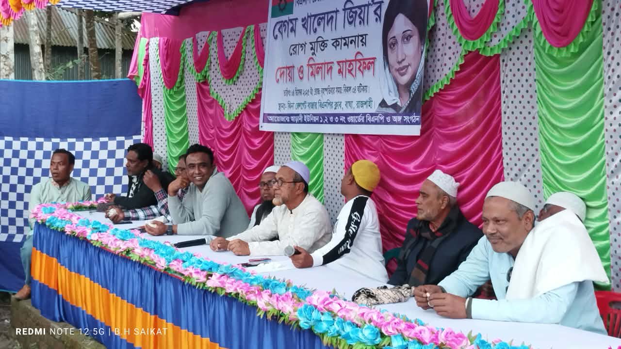 রাজশাহীর বাঘা উপজেলার আড়ানী ইউনিয়নের ১, ২ ও ৩ নং ওয়ার্ড বিএনপির উদ্যোগে বিএনপি চেয়ারপারসন ও সাবেক প্রধানমন্ত্রী বেগম খালেদা জিয়ার রোগমুক্তি কামনায় দোয়া মাহফিল অনুষ্ঠিত হয়েছে। বৃহস্পতিবার (৪ ডিসেম্বর) বিকেল ৪টায় ইউনিয়নের ঝিনা রেলগেট বাজারে এ দোয়া মাহফিল অনুষ্ঠিত হয়।