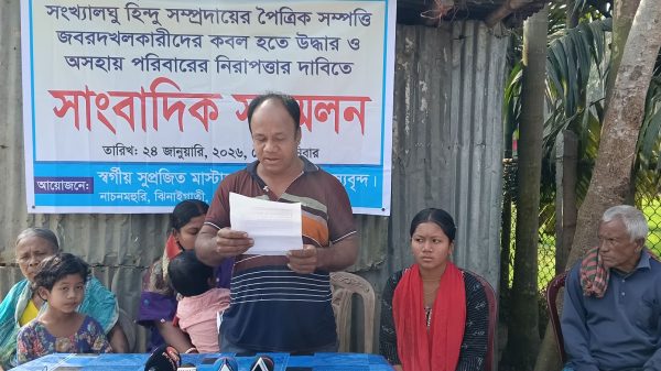 ময়মনসিংহের নান্দাইল উপজেলার আচারগাঁও ইউনিয়নের সিংদই টঙ্গিরচর মোড় এলাকার ১৫ বছর ধরে ভোগদখলকৃত জমি গোপনে বিক্রি, দখলের চেষ্টা এবং প্রাণনাশের হুমকির অভিযোগে সংবাদ সম্মেলন ও মানববন্ধন অনুষ্ঠিত হয়েছে। বুধবার (১০ ডিসেম্বর ২০২৫) দুপুর ২টায় ভুক্তভোগী পরিবার, এলাকাবাসী ও সুশীল সমাজের অংশগ্রহণে সিংদই টঙ্গিরচর মোড়ে এ কর্মসূচি অনুষ্ঠিত হয়।