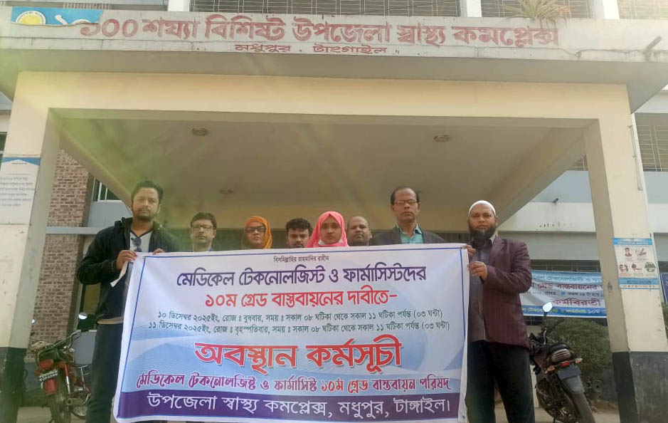 দশম গ্রেডের দাবিতে মধুপুরে মেডিকেল টেকনোলজিস্ট ও ফার্মাসিস্টদের কর্মবিরতি