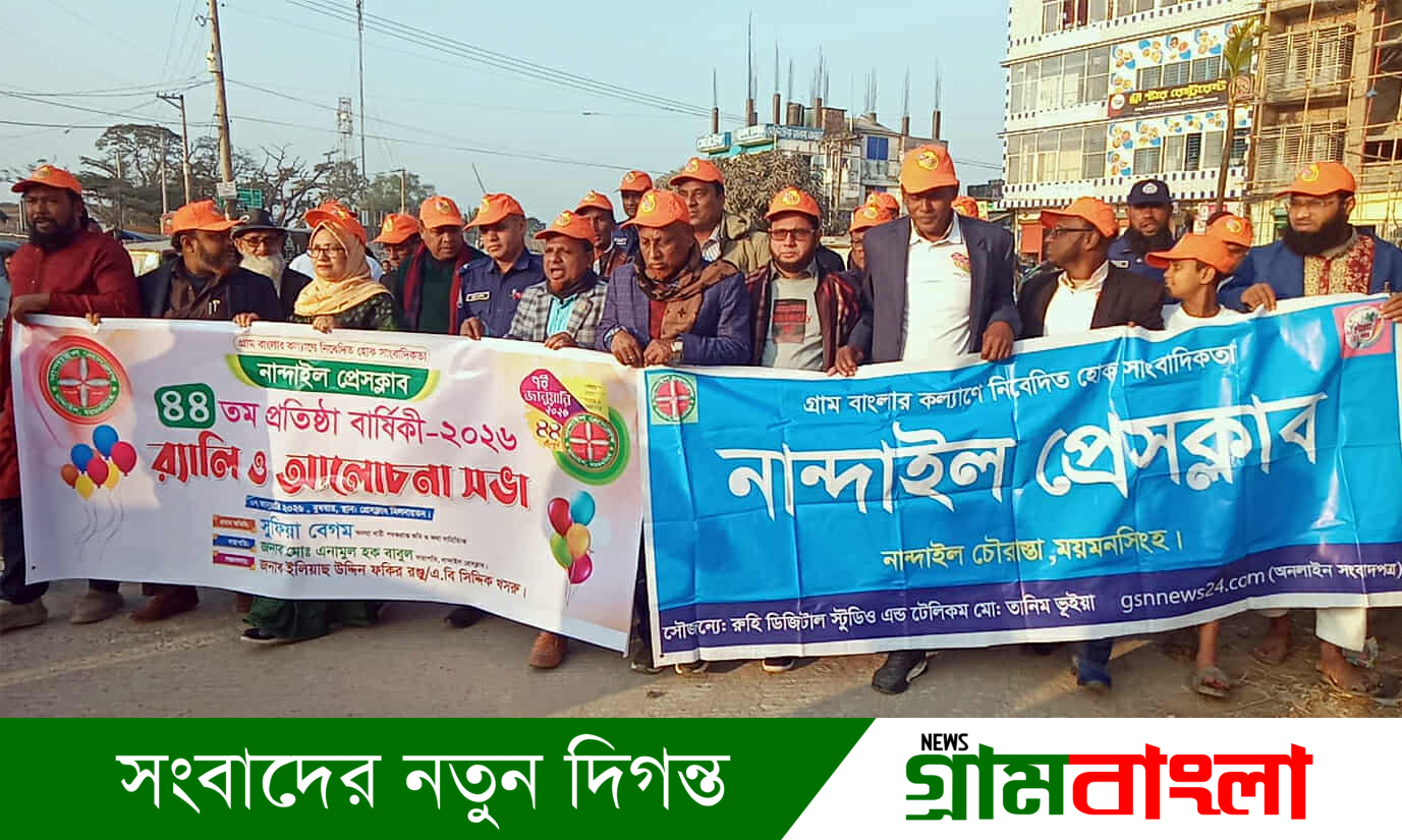 নান্দাইল (ময়মনসিংহ) প্রতিনিধি: "গ্রাম বাংলার কল্যাণে নিবেদিত হোক সাংবাদিকতা"—এই প্রতিপাদ্যকে সামনে রেখে বিপুল উৎসাহ-উদ্দীপনা ও আনন্দঘন পরিবেশে ময়মনসিংহের ঐতিহ্যবাহী নান্দাইল প্রেসক্লাবের ৪৪তম প্রতিষ্ঠাবার্ষিকী পালিত হয়েছে। বুধবার (৭ জানুয়ারি) বিকেলে বর্ণাঢ্য র্যালি, আলোচনা সভা ও কেক কাটার মধ্য দিয়ে দিবসটি উদযাপন করা হয়।