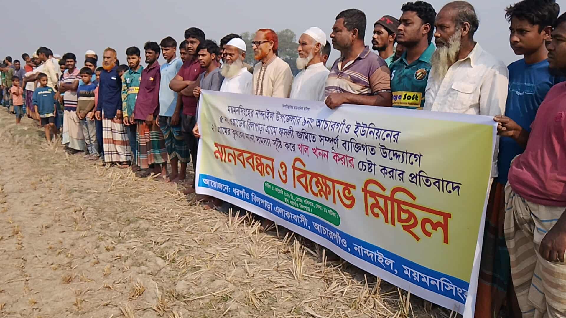 ময়মনসিংহের নান্দাইলে ফসলি জমির ওপর দিয়ে জোরপূর্বক ও অবৈধভাবে খাল খনন চেষ্টার প্রতিবাদে মানববন্ধন এবং বিক্ষোভ মিছিল করেছেন ভুক্তভোগী এলাকাবাসী। রোববার (১১ জানুয়ারি) দুপুরে উপজেলার আচারগাঁও ইউনিয়নের ধরগাঁও বিলপাড় এলাকায় খননস্থলেই এই কর্মসূচি পালিত হয়।