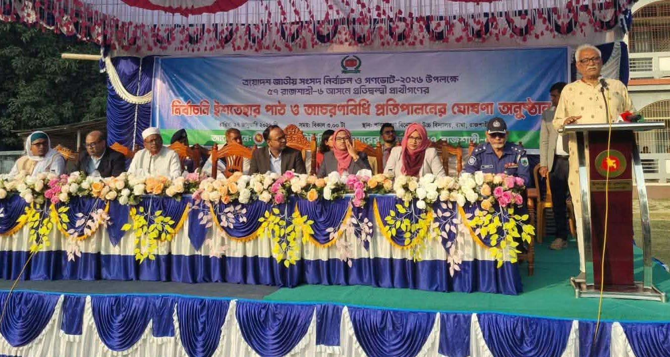 আবুল হাশেম, রাজশাহী ব্যুরো: আসন্ন ত্রয়োদশ জাতীয় সংসদ নির্বাচন ও গণভোট ২০২৬ উপলক্ষে রাজশাহী-৬ (চারঘাট-বাঘা) আসনের প্রতিদ্বন্দ্বী প্রার্থীদের নিয়ে নির্বাচনী ইশতেহার পাঠ অনুষ্ঠান অনুষ্ঠিত হয়েছে। মঙ্গলবার (২৭ জানুয়ারি) দুপুরে পারসাওতা বিনোদপুর উচ্চ বিদ্যালয় মাঠে এক আড়ম্বরপূর্ণ পরিবেশে এই অনুষ্ঠানের আয়োজন করা হয়।