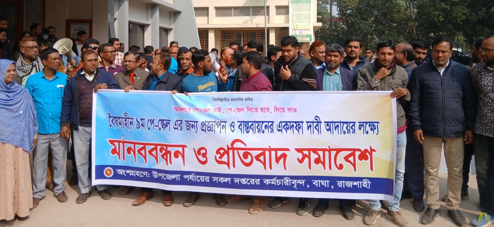 আবুল হাশেম, রাজশাহী ব্যুরো: জাতীয় বেতন পে-কমিশন ২০২৫-এর সুপারিশ দ্রুত বাস্তবায়ন ও প্রজ্ঞাপন জারির দাবিতে উত্তাল হয়ে উঠেছে রাজশাহীর বাঘা। আজ মঙ্গলবার (০৩ ফেব্রুয়ারি) সকালে বাংলাদেশ সরকারি কর্মচারী দাবি আদায় ঐক্য পরিষদের কেন্দ্রীয় কর্মসূচির অংশ হিসেবে উপজেলা চত্বরে এক বিশাল মানববন্ধন ও প্রতিবাদ সমাবেশ অনুষ্ঠিত হয়।