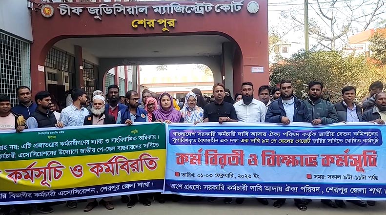 বাংলাদেশ বিচার বিভাগীয় কর্মচারী এসোসিয়েশন এবং বাংলাদেশ সরকারি কর্মচারী দাবি আদায় ঐক্য পরিষদ শেরপুর জেলা শাখার যৌথ উদ্যোগে এই কর্মসূচি পালিত হয়। বৃহস্পতিবার সকাল ৯টা থেকে শুরু হয়ে বেলা ১১টা পর্যন্ত টানা দুই ঘণ্টা এই কর্মবিরতি চলে। এসময় জেলা প্রশাসকের কার্যালয় ও আদালত চত্বরে সব ধরণের দাপ্তরিক কাজ বন্ধ থাকে, ফলে দূর-দূরান্ত থেকে আসা সেবাগ্রহীতারা সাময়িক ভোগান্তিতে পড়েন।