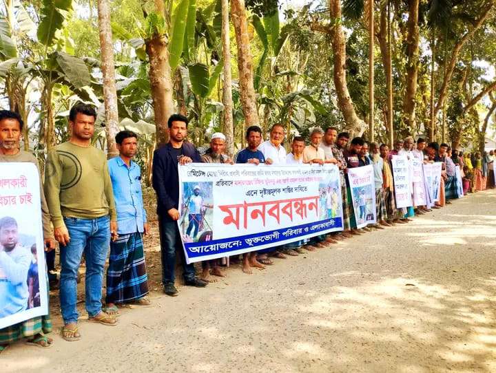 মানববন্ধনে বক্তব্য রাখেন আবুল হোসেন, ইউসুফ আলী, গোলাম মাওলা, নাসিমা বেগম, ফিরোজা বেগম, আনিছুর রহমান ও মালেক মন্ডল প্রমুখ।