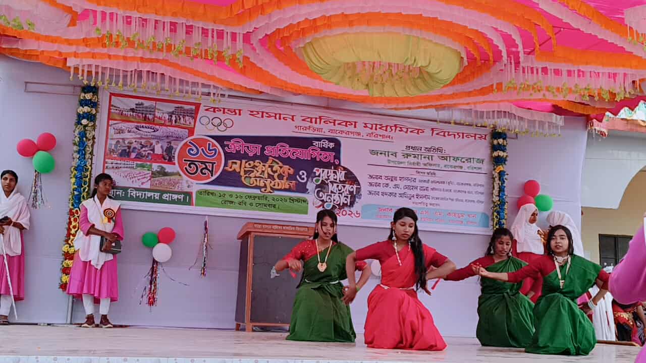 বাকেরগঞ্জ: বরিশালের বাকেরগঞ্জ উপজেলার কান্তা হাসান বালিকা মাধ্যমিক বিদ্যালয়ে দুই দিনব্যাপী বার্ষিক ক্রীড়া প্রতিযোগিতা ও সাংস্কৃতিক অনুষ্ঠান-২০২৬ উৎসবমুখর পরিবেশে সম্পন্ন হয়েছে। রোববার (১৫ ফেব্রুয়ারি) সকালে বিদ্যালয় প্রাঙ্গণে এই বর্ণাঢ্য অনুষ্ঠানের সমাপনী ও পুরস্কার বিতরণী অনুষ্ঠিত হয়।