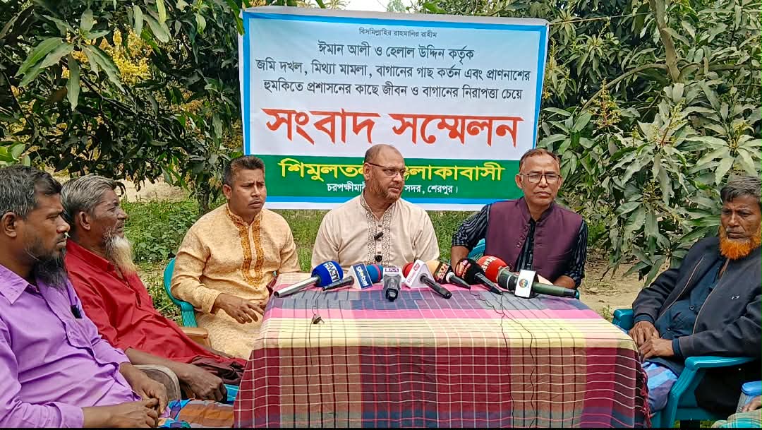 শেরপুর সদর উপজেলার চরপক্ষীমারী এলাকার শিমুলতলী গ্রামে জমি দখলের চেষ্টা, আমবাগানের গাছ কর্তন এবং প্রাণনাশের হুমকির প্রতিবাদে সংবাদ সম্মেলন করেছেন ভুক্তভোগী পরিবার ও এলাকাবাসী। অভিযুক্তদের অব্যাহত হুমকিতে চরম নিরাপত্তাহীনতায় ভুগছেন বলে প্রশাসনের কাছে জীবন ও সম্পদের নিরাপত্তা দাবি করেছেন তারা।