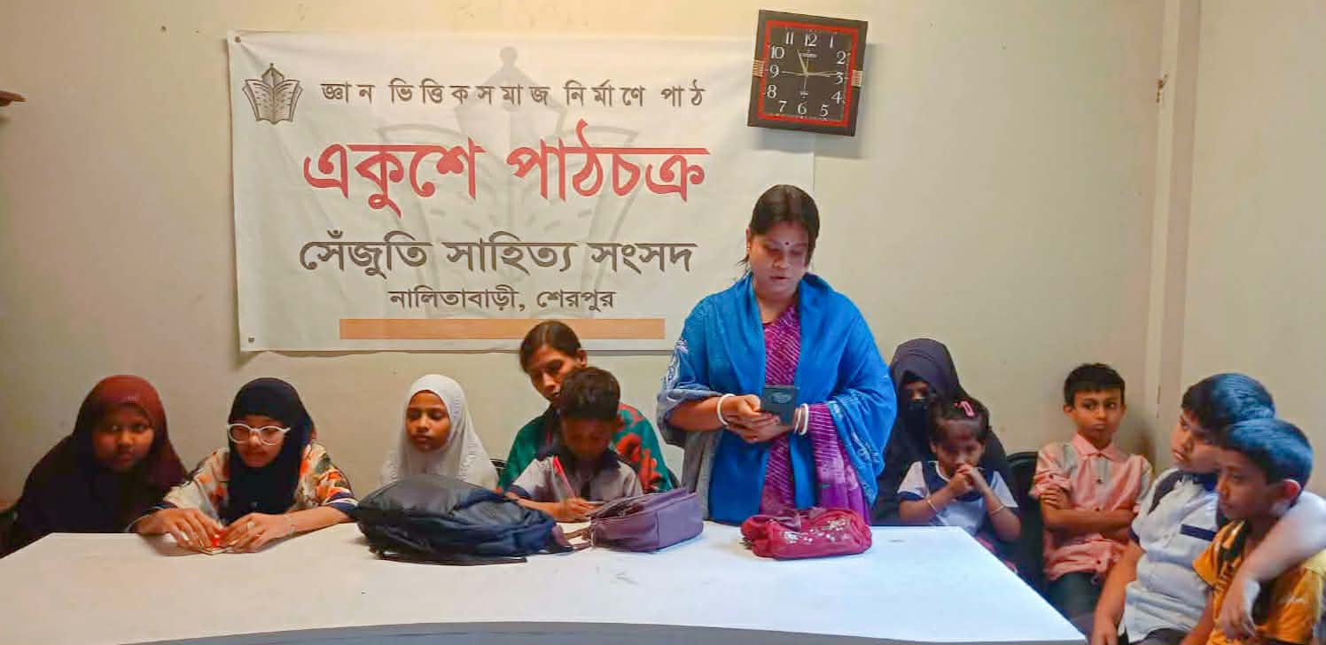‘জ্ঞানভিত্তিক সমাজ নির্মাণে পাঠ’—এই স্লোগানকে সামনে রেখে শেরপুরের নালিতাবাড়ীতে একুশে পাঠচক্রের ১২১তম নিয়মিত আসর অনুষ্ঠিত হয়েছে। বৃহস্পতিবার (২৬ ফেব্রুয়ারি) দুপুরে পৌর শহরের সেঁজুতি অঙ্গনে এই আসরটি আয়োজন করা হয়।