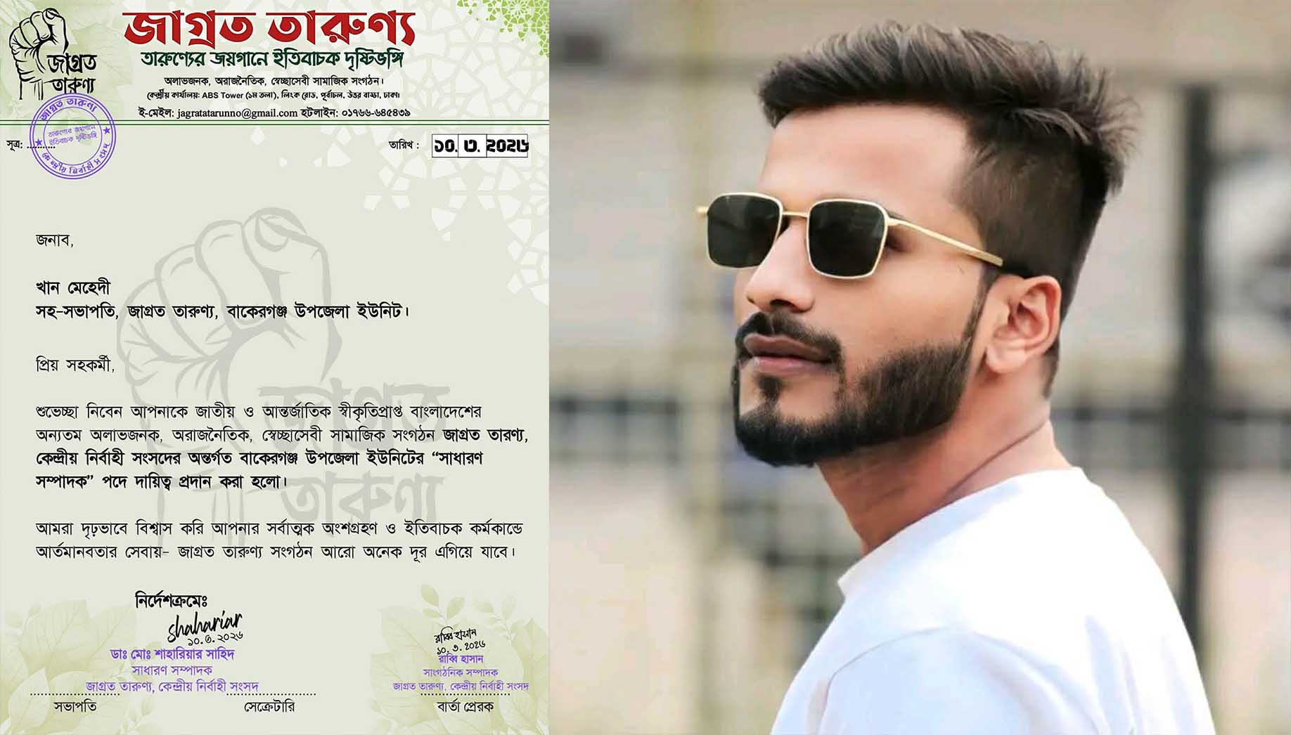 সংগঠনের কেন্দ্রীয় কমিটির সাধারণ সম্পাদক ডাঃ মোঃ শাহরিয়ার সাহিদ এবং সাংগঠনিক সম্পাদক রাব্বি হাসান স্বাক্ষরিত এক পত্রে আজ (১০ মার্চ) এই কমিটির অনুমোদন দেওয়া হয়। পত্রে উল্লেখ করা হয়, সংগঠনের আদর্শ, লক্ষ্য ও কর্মসূচিকে এগিয়ে নিতে এবং তরুণদের সামাজিক কর্মকাণ্ডে সক্রিয় অংশগ্রহণ নিশ্চিত করার লক্ষে সাংবাদিক খান মেহেদীকে এই গুরুত্বপূর্ণ দায়িত্ব প্রদান করা হয়েছে।
