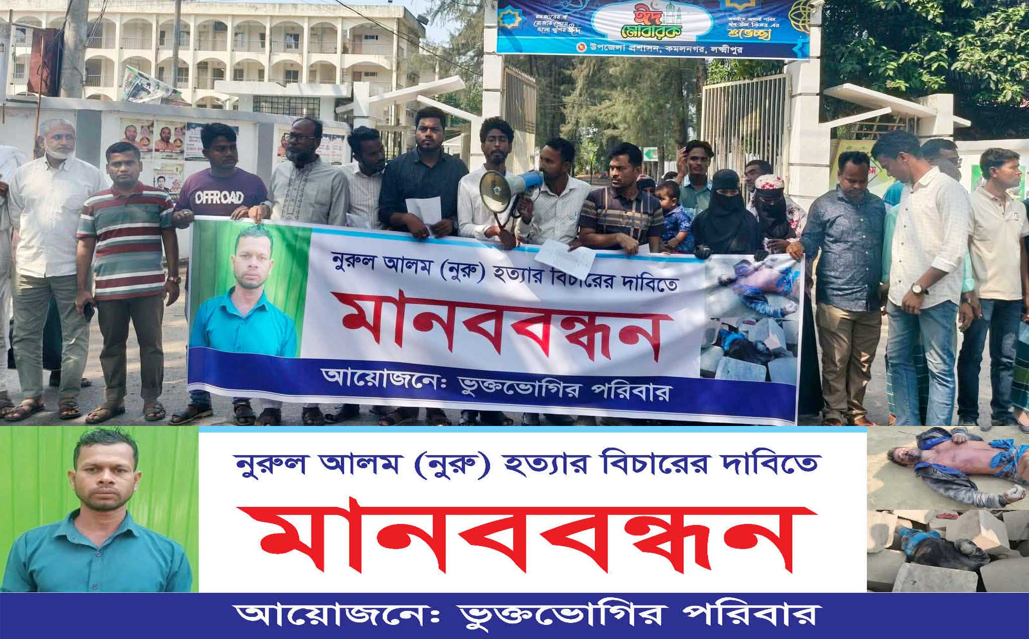 লক্ষ্মীপুর: লক্ষ্মীপুরের কমলনগরে চাঞ্চল্যকর নুরুল আলম নুরু হত্যাকাণ্ডের সুষ্ঠু বিচার ও খুনিদের দৃষ্টান্তমূলক শাস্তির দাবিতে ফুঁসে উঠেছে নিহতের পরিবার ও এলাকাবাসী। সোমবার (২৩ মার্চ) উপজেলার সামনে লক্ষ্মীপুর-রামগতি মহাসড়কে এক বিশাল মানববন্ধন কর্মসূচি পালন করা হয়।