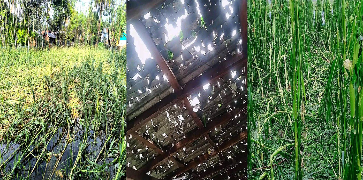 ক্ষয়ক্ষতির চিত্র: উপজেলা কৃষি অফিসের প্রাথমিক তথ্যমতে, শিলাবৃষ্টির আঘাতে ৫০ হেক্টর ভুট্টা, ১০ হেক্টর গম, ১২ হেক্টর মরিচ এবং ৩ হেক্টর শাকসবজি ক্ষতিগ্রস্ত হয়েছে। ঝরে পড়েছে আম ও লিচুর মুকুল। বিশেষ করে গয়াবাড়ি, বালাপাড়া ও ছাতনাইসহ বেশ কিছু ইউনিয়নে ফসলের মাঠ এখন ধ্বংসস্তূপে পরিণত হয়েছে। শুধু কৃষি নয়, অনেক বসতবাড়ির টিনের চালা ফুটো হয়ে গেছে এবং গাছপালা ভেঙে পড়েছে।
