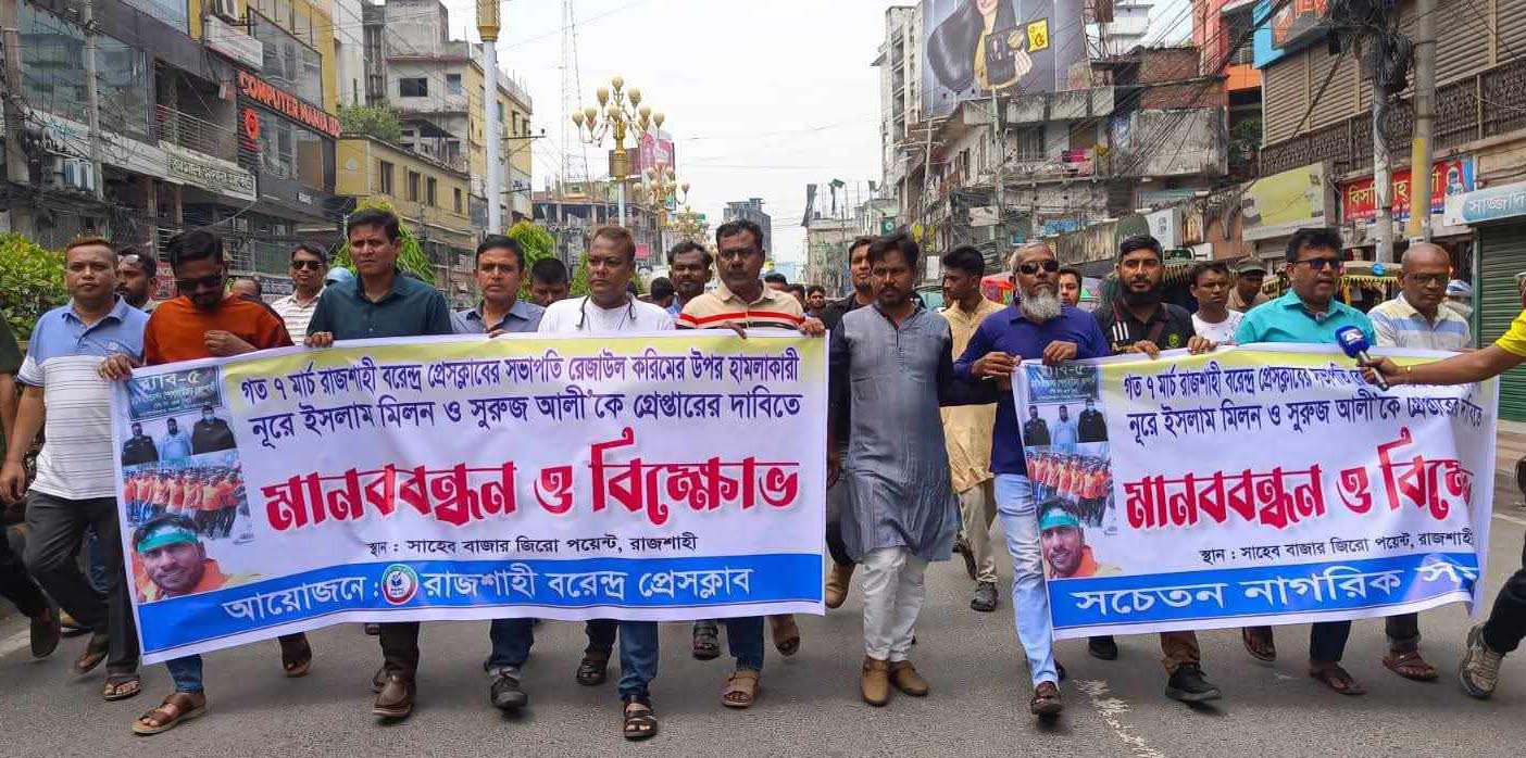 আবুল হাশেম, রাজশাহী ব্যুরো: রাজশাহী বরেন্দ্র প্রেসক্লাবের সভাপতি রেজাউল করিমের ওপর সশস্ত্র হামলার প্রতিবাদ এবং জড়িতদের দ্রুত গ্রেপ্তারের দাবিতে উত্তাল হয়ে উঠেছে রাজশাহী। শনিবার (২৮ মার্চ) সকাল ১১টায় মহানগরীর সাহেববাজার জিরো পয়েন্টে আয়োজিত এক বিশাল মানববন্ধন ও বিক্ষোভ কর্মসূচিতে সাংবাদিক নেতারা এই ন্যাক্কারজনক ঘটনার তীব্র নিন্দা জানান।