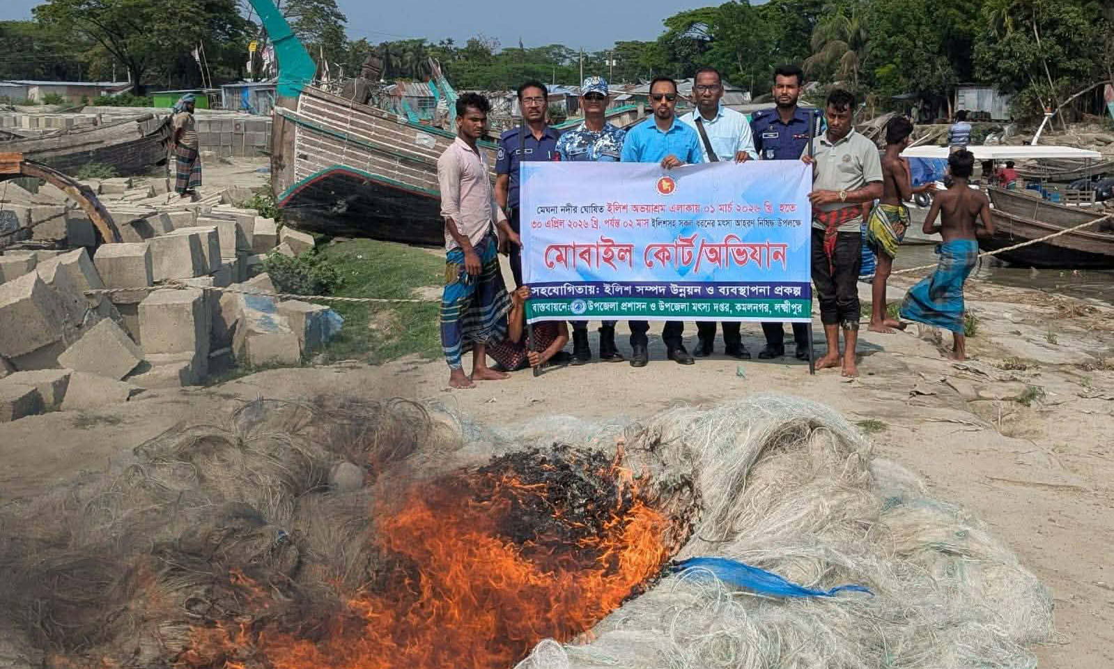 নৌকা ও জাল: ৬টি নৌকা ও বিপুল পরিমাণ কারেন্ট জাল জব্দ করা হয়েছে। জব্দকৃত জাল জনসম্মুখে পুড়িয়ে বিনষ্ট করা হয়।