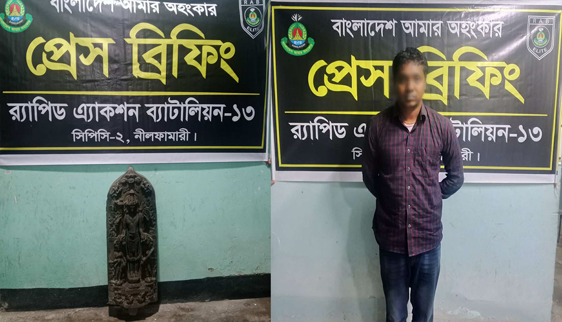 পঞ্চগড়ের দেবীগঞ্জে অভিযান চালিয়ে মূল্যবান প্রত্নতাত্ত্বিক সম্পদ কষ্টিপাথরের একটি বিষ্ণু মূর্তি উদ্ধার করেছে র্যাব-১৩। উদ্ধারকৃত মূর্তিটির আনুমানিক বাজার মূল্য প্রায় ৮৭ লাখ টাকা। অভিযানে পাচারের সাথে জড়িত একজন পেশাদার চোরাকারবারিকে আটক করা হয়েছে।