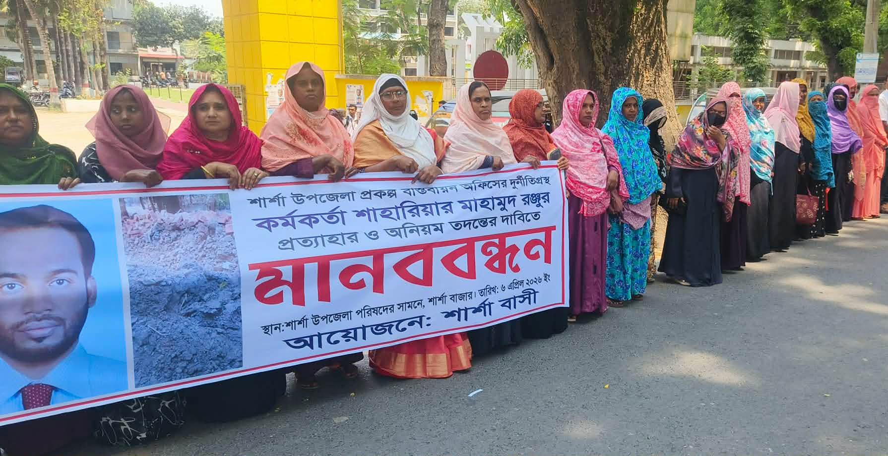 সোমবার (৬ এপ্রিল) বেলা ১১টার দিকে শার্শা উপজেলা পরিষদের সামনে এ মানববন্ধন অনুষ্ঠিত হয়। কর্মসূচি শেষে উপজেলা নির্বাহী কর্মকর্তা (ইউএনও) বরাবর একটি স্মারকলিপি প্রদান করেন আন্দোলনকারীরা।