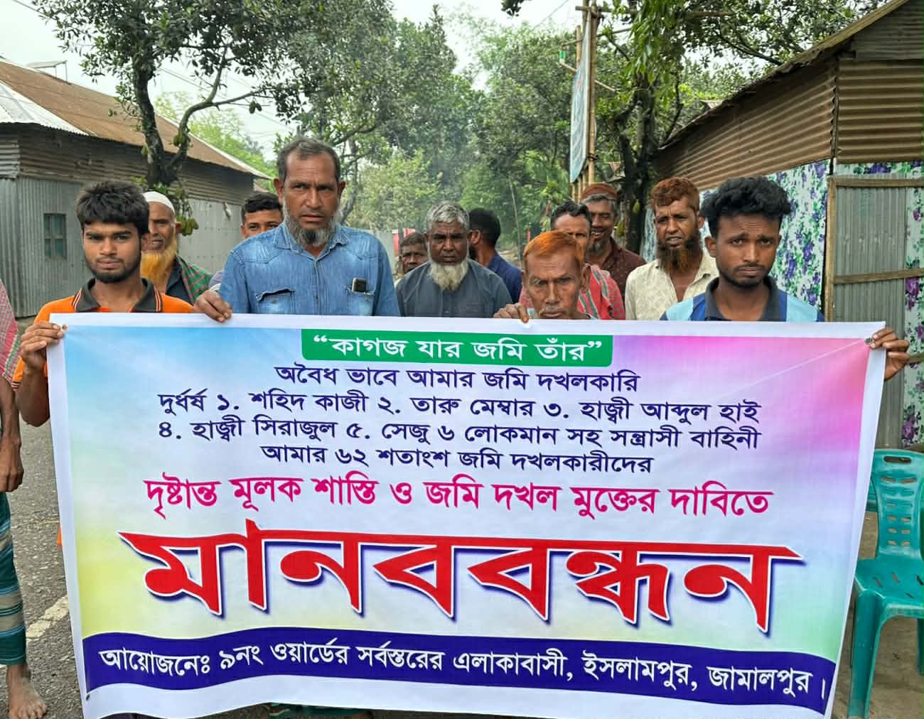 ইসলামপুর (জামালপুর): জামালপুরের ইসলামপুর উপজেলার চরপুটিমারী ইউনিয়নের ৯নং ওয়ার্ডে পৈত্রিক জমি অবৈধভাবে দখলের প্রতিবাদে এবং তা উদ্ধারের দাবিতে মানববন্ধন করেছে ভুক্তভোগী পরিবার ও এলাকাবাসী। রোববার (১৯ এপ্রিল) বেলা ৩ ঘটিকার সময় চরপুটিমারী এলাকায় এই কর্মসূচি পালিত হয়।