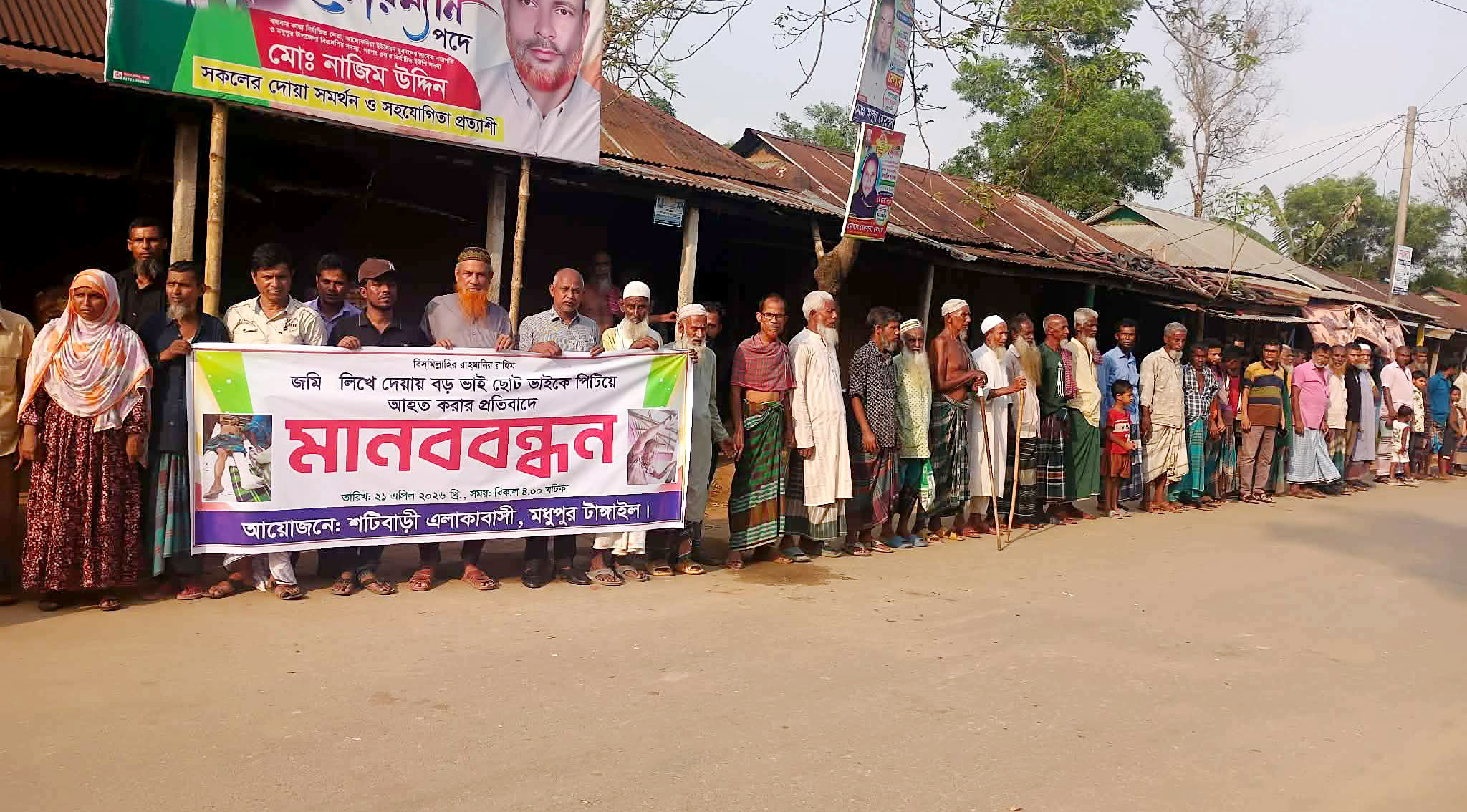 টাঙ্গাইলের মধুপুরে পৈত্রিক জমি লিখে দেওয়াকে কেন্দ্র করে বড় ভাই কর্তৃক ছোট ভাইকে ঘরে আটকে রেখে হাত-পা বেঁধে রাতভর পৈশাচিক নির্যাতনের প্রতিবাদে মানববন্ধন ও বিক্ষোভ কর্মসূচি পালিত হয়েছে।