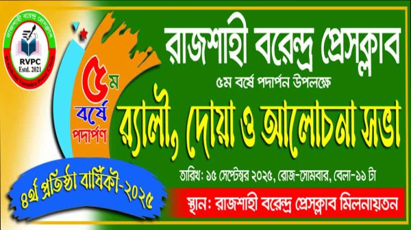 নিজস্ব প্রতিবেদক:রাজশাহী বরেন্দ্র প্রেসক্লাব উদযাপন করতে যাচ্ছে তার গৌরবময় ৪র্থ প্রতিষ্ঠাবার্ষিকী এবং ৫ম বর্ষে পদার্পণ। এ উপলক্ষে আগামী ১৫ সেপ্টেম্বর (সোমবার) সকাল ১১টায় ক্লাব মিলনায়তনে আয়োজন করা হয়েছে দিনব্যাপী বর্ণাঢ্য
