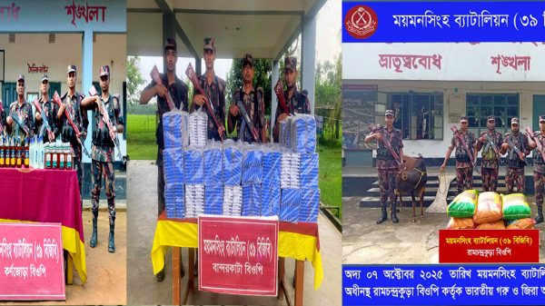 মুহাম্মদ আবু হেলাল, শেরপুর প্রতিনিধি:ময়মনসিংহ ব্যাটালিয়ন (৩৯ বিজিবি) পরিচালিত পৃথক অভিযানে সীমান্ত এলাকা থেকে অর্ধকোটি টাকার চোরাচালানী মালামাল, পাঁচটি ভারতীয় গরু, ২৪ জন বাংলাদেশি অনুপ্রবেশকারী এবং দুই মানবপাচারকারীকে আটক করেছে